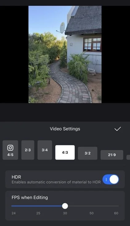 5. In the top right, tap on the blue share button, enable HDR, set the resolution to maximum, the FPS to minimum, and tap on “Export”.